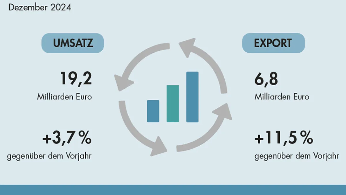 Nach Angaben des Branchenverbandes BVE verzeichnete die deutsche Lebensmittelindustrie im Dezember 2024 einen preisbereinigten Umsatzrückgang von 0,3 Prozent im Vergleich zum Vorjahresmonat. Das Inlandsgeschäft sank um 2,7 Prozent, während das Auslandsgeschäft um 4,3 Prozent zulegte. Insgesamt setzten die Lebensmittelhersteller 19,2 Milliarden Euro um, nominal ein Prozent weniger als ein Jahr zuvor. Auf dem Inlandsmarkt erwirtschaftete die Branche einen Umsatz von 12,3 Milliarden Euro und lag damit nominal um 0,1 Prozent unter dem Vorjahresergebnis. Die Auslandsumsätze erreichten 6,8 Milliarden Euro und stiegen nominal deutlich um 11,5 Prozent. Der Anstieg resultierte vor allem aus einer deutlichen Erhöhung der Exportpreise um 6,9 Prozent, während die Inlandspreise um 2,6 Prozent über dem Vorjahresniveau lagen. Der kalender- und saisonbereinigte Produktionsindex stieg im Vergleich zum Vorjahresmonat leicht um 1,4 Prozent.