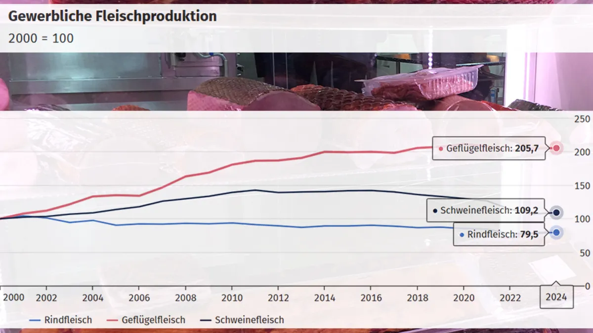 Die erzeugte Menge an Geflügelfleisch stieg im Jahr 2024 gegenüber 2023 um 0,3 Prozent auf 1,6 Millionen Tonnen. Der Anstieg ist allein auf die um 1,8 Prozent auf 1,1 Millionen Tonnen gestiegene Erzeugung von Jungmasthühnerfleisch zurückzuführen. Dagegen ging die Erzeugung von Putenfleisch um 2,1 Prozent auf 408.100 Tonnen zurück. Insgesamt wurden im Jahr 2024 rund 653,8 Millionen Hühner in den Betrieben geschlachtet, davon 626,7 Millionen Jungmasthühner und 27,1 Millionen Suppenhühner. Hinzu kamen 30,2 Millionen Puten und 9,3 Millionen Enten.