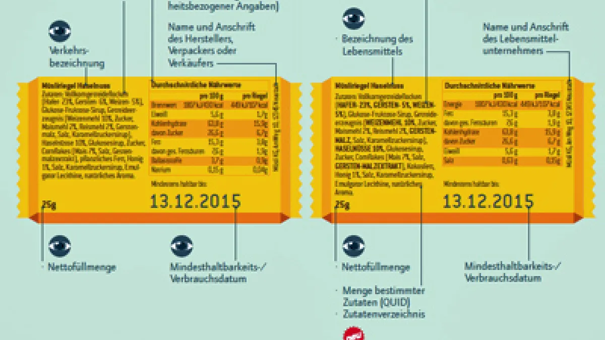Die wichtigste optische Änderung betrifft die Mindestschriftgröße, diese beträgt nun 1,2 mm bezogen auf die Höhe des kleinen Buchstaben "x". Allergene Zutaten werden im Zutatenverzeichnis hervorgehoben, beispielsweise durch Fettdruck, Großbuchstaben oder eine andere Farbe, so dass sie sofort erkennbar sind. Die wichtigste neue Informationspflicht ist die Nährwertkennzeichnung. Nährwertangaben müssen in Form einer Tabelle bezogen auf 100ml bzw. 100g in vorgeschriebener Reihenfolge erfolgen: Brennwert, Fett, gesättigte Fettsäuren, Kohlenhydrate, Zucker, Eiweiß und Salz. Je nach Produkt gelten weiterhin neue Informationspflichten zu Auftauhinweisen und Einfrierdaten, zu pflanzlichen Ölen und Fetten, der Herkunft von Fleisch, Nanozutaten, dem Koffeingehalt sowie zu Ersatzzutaten und aus Fleisch- oder Fischstücken zusammengefügten Erzeugnissen. Für Minhoff ist klar: „Die Lebensmitteletiketten informieren mit dem Geltungsbeginn der neuen Verordnung umfassender als jemals zuvor über Inhaltsstoffe, Nährwerte, Haltbarkeit, Aufbewahrung, Zubereitung und vieles mehr. Sie sind eine verlässliche Grundlage für eine informierte Kaufentscheidung.“